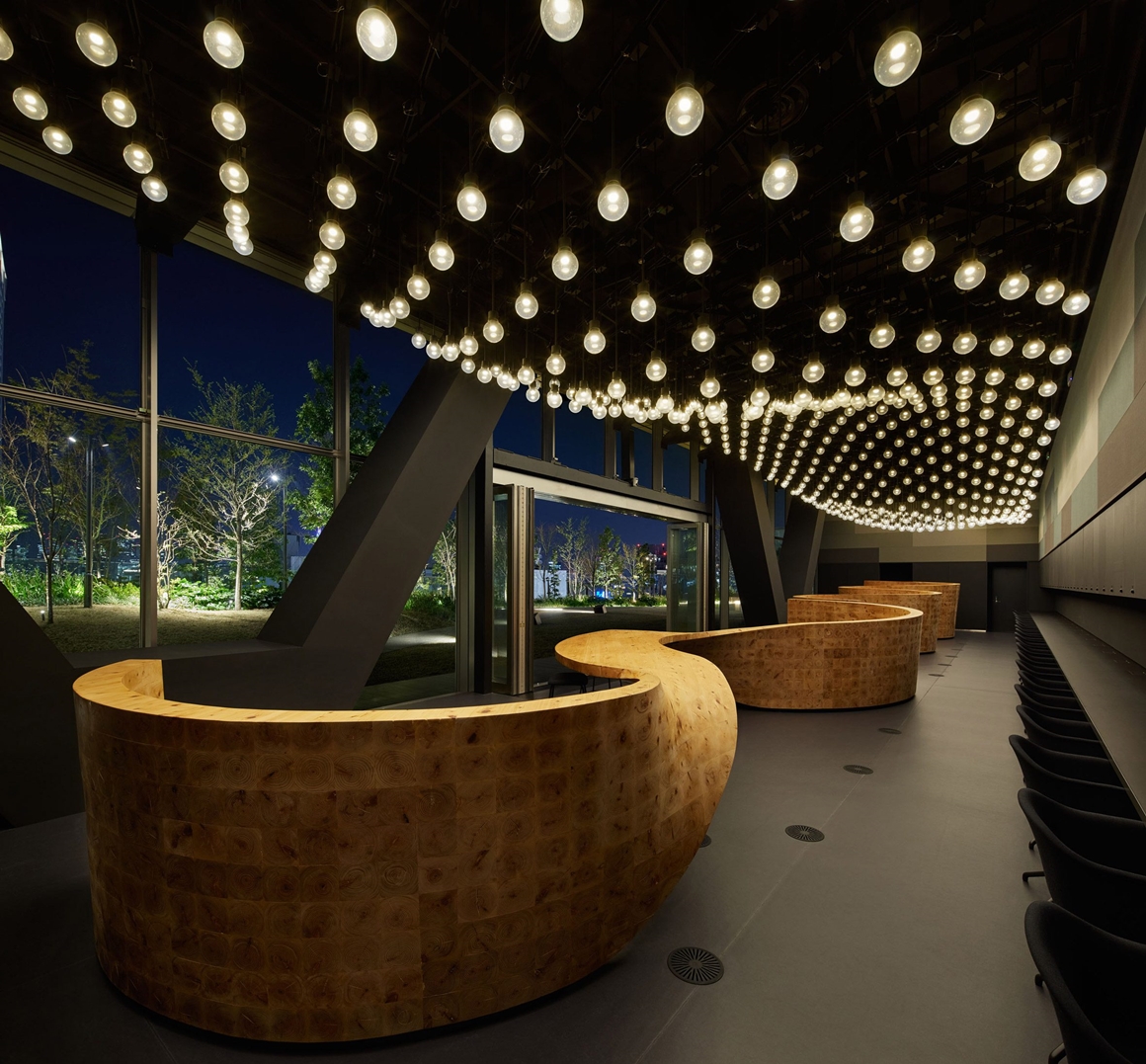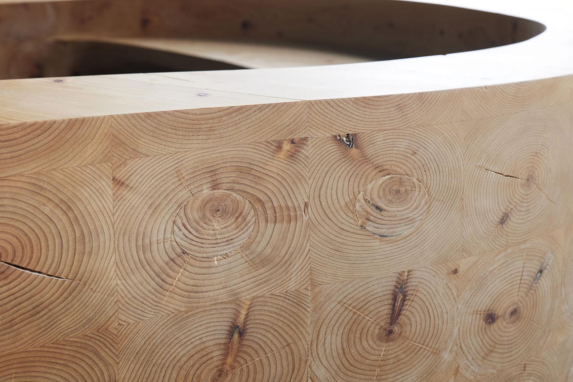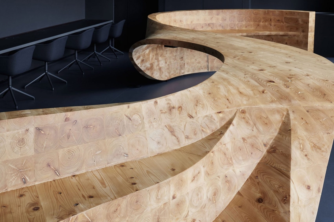 Để tăng sức cuốn hút và tạo cảm hứng sáng tạo, hai chiếc bàn khổng lồ đều được làm thủ công từ cây tuyết tùng Nhật Bản, loại vật liệu được chọn để mang đến cho căn phòng một mùi hương tự nhiên. Với mục đích đạt độ cân bằng thị giác, phần còn lại của căn phòng được giữ rất đơn giản, chỉ với một số đồ nội thất khác gồm ghế đẩu hợp tông với màu tối của sàn nhà và 534 bóng đèn treo. Cùng với đó là không gian được bao quanh bởi tủ phủ vải sơn và các tường dệt âm, tạo nên hình ảnh trừu tượng của núi Phú Sĩ, một bức nền hoàn hảo cho chủ đề của những thiết kế trong công trình này.