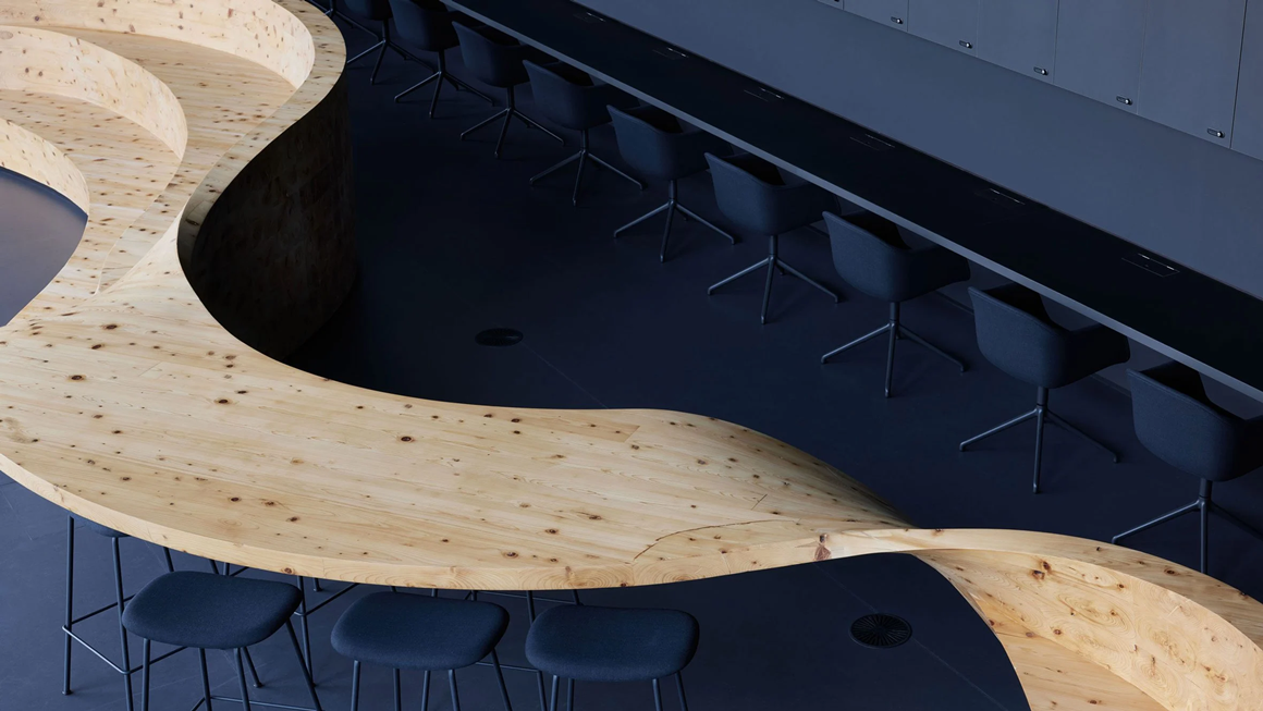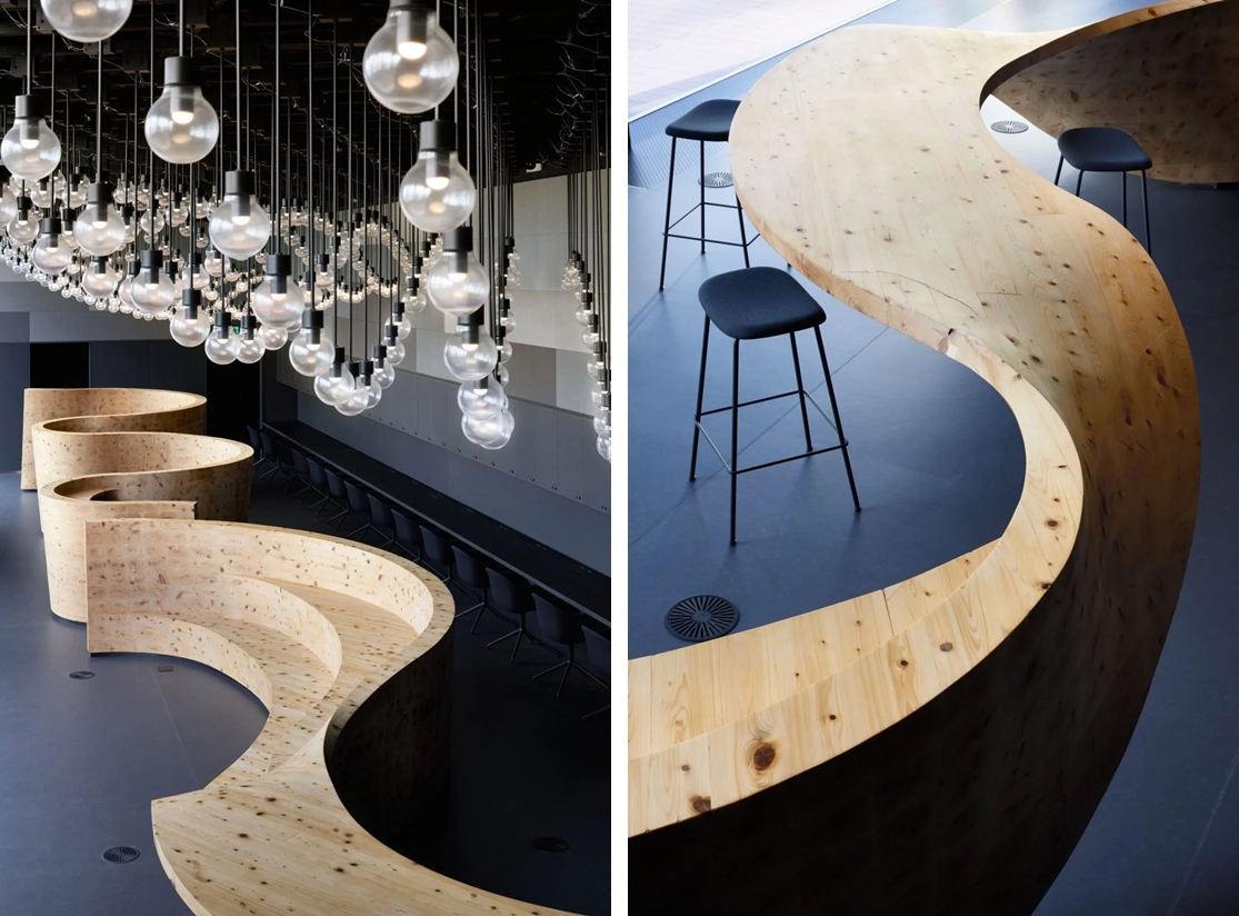 Để thể hiện ý tưởng này, các nhà thiết kế  đã lấp đầy không gian bằng “siêu nội thất”, thay vì sử dụng các bàn làm việc riêng lẻ. Nổi bật giữa căn phòng trên tầng số 10 của một tòa cao ốc là hai chiếc bàn khổng lồ bằng gỗ uốn cong xuyên suốt toàn bộ không gian, phục vụ nhiều chức năng khác nhau và kết hợp cả khu vực chỗ ngồi để nhiều người có thể sử dụng đồng thời.