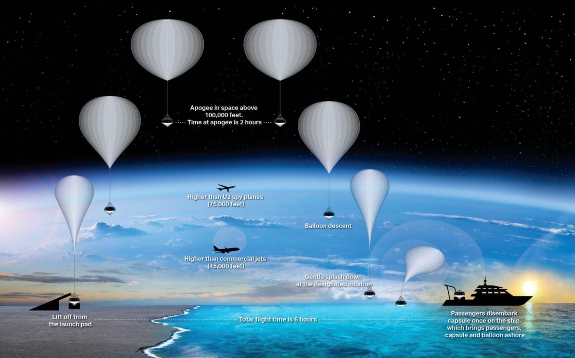 Toàn bộ hành trình mất khoảng sáu giờ – hai giờ bay lên, hai giờ trên đỉnh điểm, nhẹ nhàng trôi nổi trên 99% bầu khí quyển; và hai giờ đi xuống trước khi hạ cánh êm ái trên biển và được đón về bởi một chiếc du thuyền đang neo đậu gần đó.